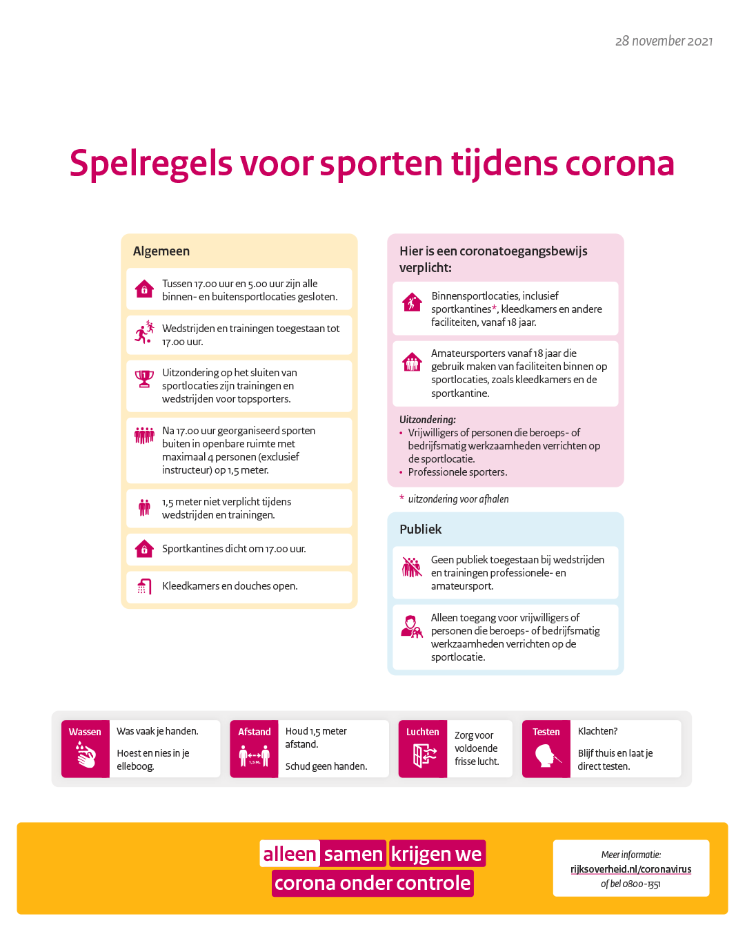 Er zijn afgelopen vrijdag nieuwe coronamaatregelen afgekondigd met vergaande consequenties, ook voor sport- en beweegaanbieders zoals sportverenigingen, zwembaden en fitnessclubs. De maatregelen zijn ingegaan op zondag 28 november 2021 om 05.00 uur.