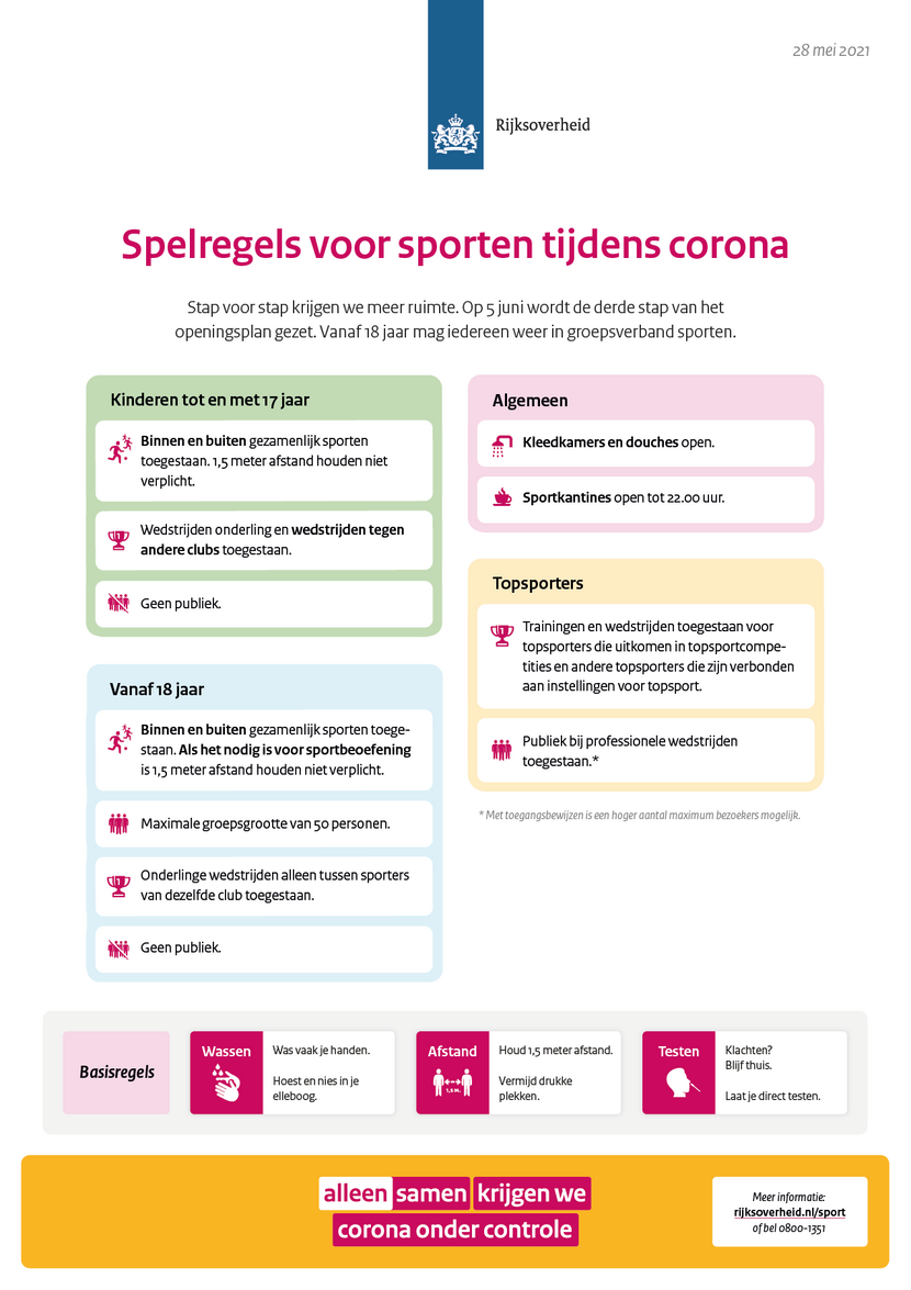 Op zaterdag 5 juni gaat de derde stap van het openingsplan in. Voor de sport betekent dit onder andere dat bij teamsporten de afstandsregels worden versoepeld, jeugd weer competitie mag spelen, groepslessen zijn toegestaan en de deuren van sportkantines onder voorwaarden weer open kunnen. Hieronder een overzicht met de belangrijkste wijzigingen ten opzichte van de al eerder geldende maatregelen.