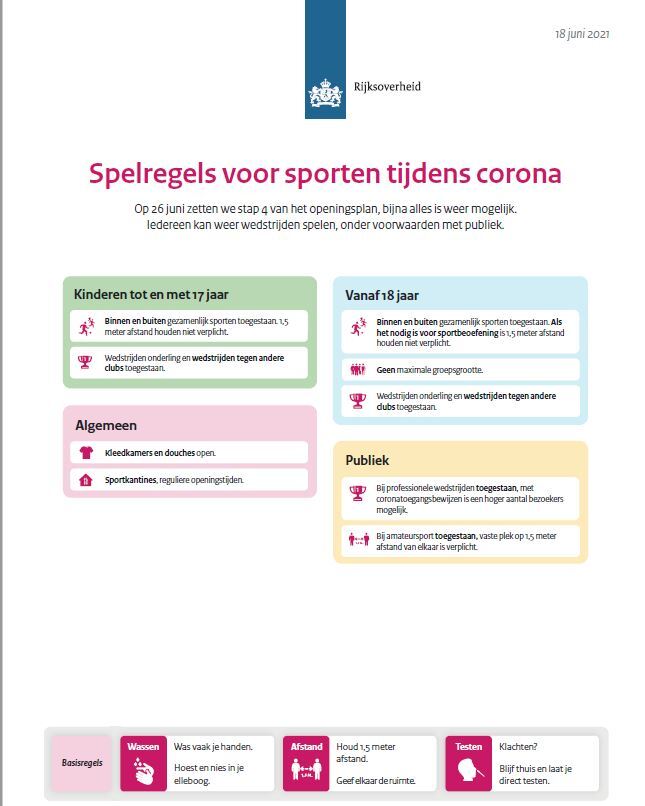 Op zaterdag 26 juni worden de volgende stappen in het heropeningsplan gezet. Voor de sport betekent dit onder andere dat wedstrijden vanaf dit moment weer voor iedereen zijn toegestaan en dat publiek bij amateurwedstrijden en trainingen onder voorwaarden weer welkom is. Hieronder een overzicht met de belangrijkste wijzigingen ten opzichte van de eerdere versoepelingen.