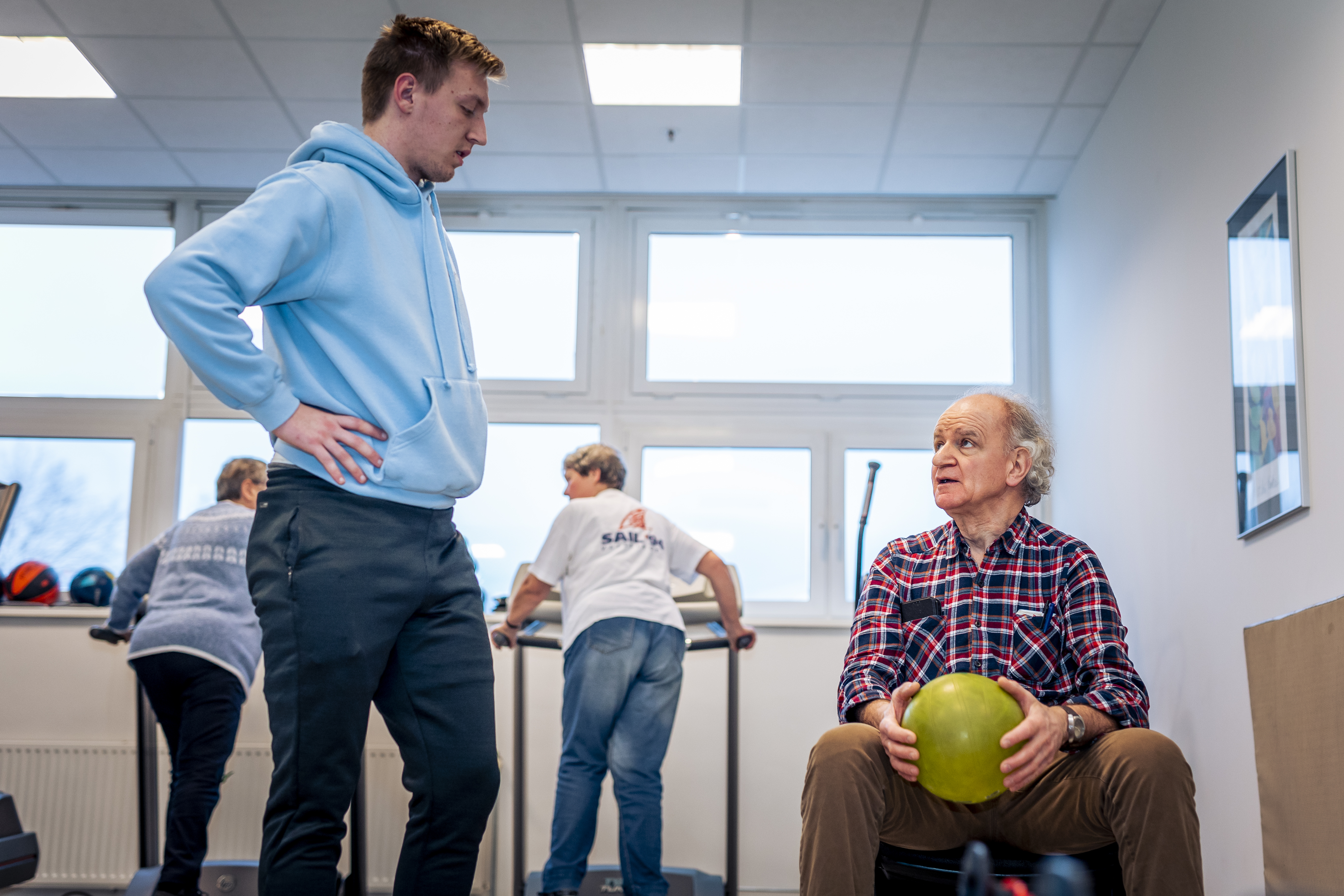 Sporten in de sportzaal op fitnesstoestellen onder begeleiding en op ieders tempo aangepast